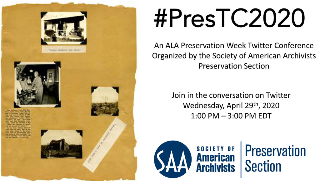 The 3rd annual Preservation Week Twitter Conference brought to you by the Society of American Archivists Preservation Section<https://www2.archivists.org/groups/preservation-section> will be held on Wednesday April 29, beginning at 1pm.